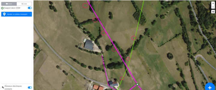 Un rendu thématique mettant en valeur les poteaux connus d’OSM – Gespot.frUn extrait de photo 5cm produit par l’IGN au dessus d’un poste électrique